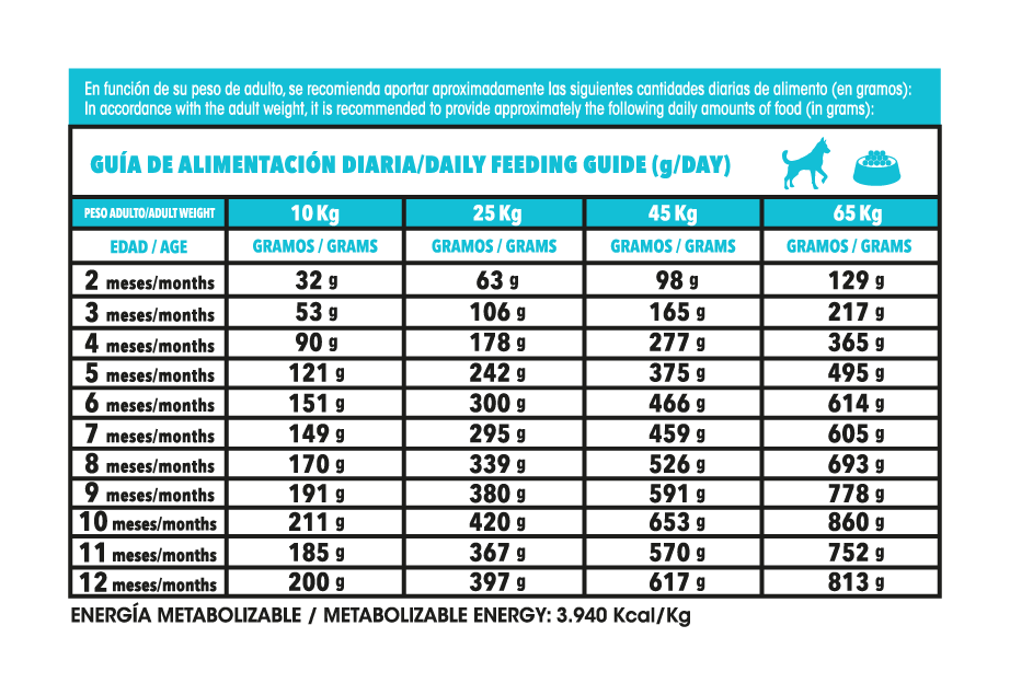 Modo de empleo: El producto debe ser administrado en forma seca. Deje siempre agua fresca y limpia a disposición de su perro. La cantidad diaria de este alimento que necesita su perro depende de diversos factores como el peso, la actividad diaria, edad, ambiente natural… De manera orientativa, para perros adultos que realizan una actividad normal, dependiendo de su peso corporal, se recomienda aportar las siguientes cantidades diarias.